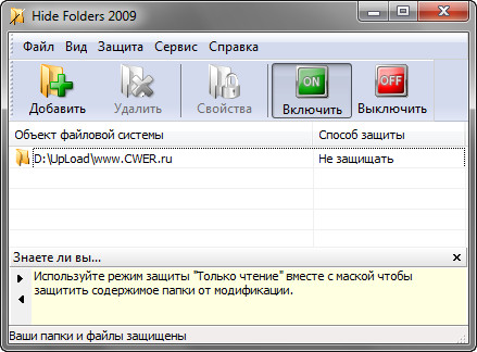 Hide Folders - это удобный инструмент для сокрытия вашей конфиденциальной информации от посторонних. Программа, которую можно бесплатно скачать на cwer.ws, позволяет скрывать целые папки на компьютерах под управлением Windows. Очень удобна и проста в использовании.