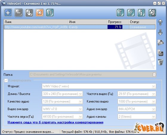 VideoGet - это программа для скачивания видео клипов с больше чем 100+ видео веб-сайтов (YouTube, Yahoo Video, MySpace, VSocial, Metacafe, и много-много других). Многие из этих веб-сайтов держат видео в FLV формате, и большинство людей не знает как проигрывать эти файлы VideoGet также позволит вам конвертировать все видео в множество популярных форматов для более комфортного проигрывания VideoGet поддерживает AVI, MPEG1, MPEG2, WMV, FLV, MP4, 3GP, MP3 форматы, так что вы имеете возможность не только посмотреть видео на своем компьютере, но и переписать его на свой iPod, мобильный телефон или любой другой портативный прибор. Кроме того вы самостоятельно можете задавать настройки конвертации.