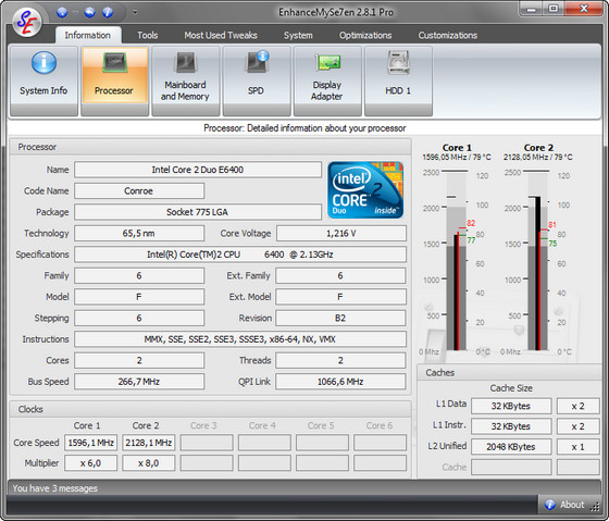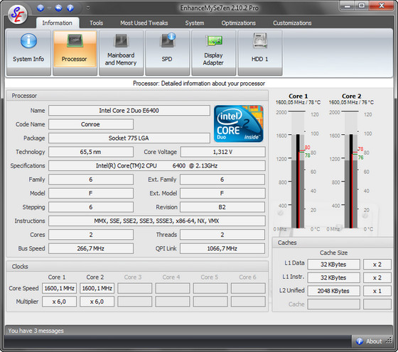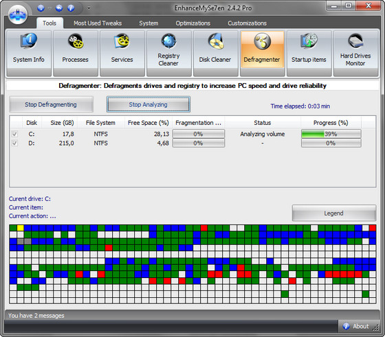 EnhanceMySe7en включает в себя менджер автозагрузки, менеджер процессов, модуль очистки жесткого диска, дефрагментатор жесткого диска, "чистильщик" системного реестра, монитор жесткого диска (температура, время работы, серийный номер и т.п.), модуль настройки интернет-соединения, а также средства для быстрого доступа к "тонким" настройкам операционной системы.