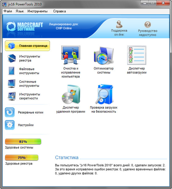 jv16 PowerTools - одна из лучших программ для работы с системным реестром и поддержания в оптимальном состоянии. Включает в себя инструменты для работы с реестром: мощный менеджер реестра - позволяет работать со списком программ из автозагрузки и деинсталляции, со списком зарегистрированных в системе типов файлов, расширений, контекстным меню IE (с тем, в которое часто вставляют свои пункты менеджеры закачек) и некоторыми другими. Этот менеджер часто помогает вручную удалить остатки после автоматической очистки реестра программы. Возможно использование в локальной сети.