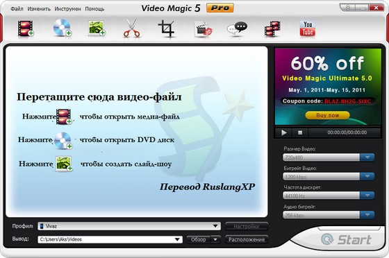 Blaze Video Magic - надежный и мощный многофункциональный конвертер видео, доступный и очень простой в использовании. Blaze Video Magic позволяет конвертировать аудио, видео, фотографии, уменьшая их размер для просмотра на мобильных устройствах. Выполняет конвертирование с довольно приличной скоростью и минимальными затратами времени. Поддерживает работу со видео-файлами форматов RM, RMVB, AVI, WMV, ASF, MPG, MPEG, MPE, M1V, MPV2, MP4, 3GP, FLV, DAT, MOV, VOB, позволяя конвертировать их в AVI (с использованием кодеков MPEG4, DivX или XVID), ASF, MP4, 3GP, PSP, MOV (MPEG4). Также с помощью программы можно разрезать большие видео-файлы на несколько маленьких, конвертировать аудио-файлы в формат MP3, конвертировать графические файлы BMP, JPG, GIF, TIF, PNG в JPEG.