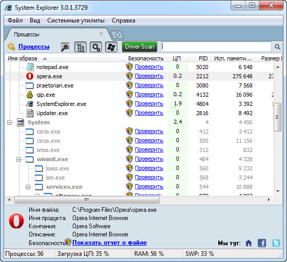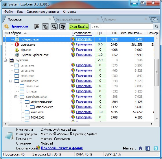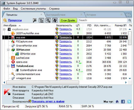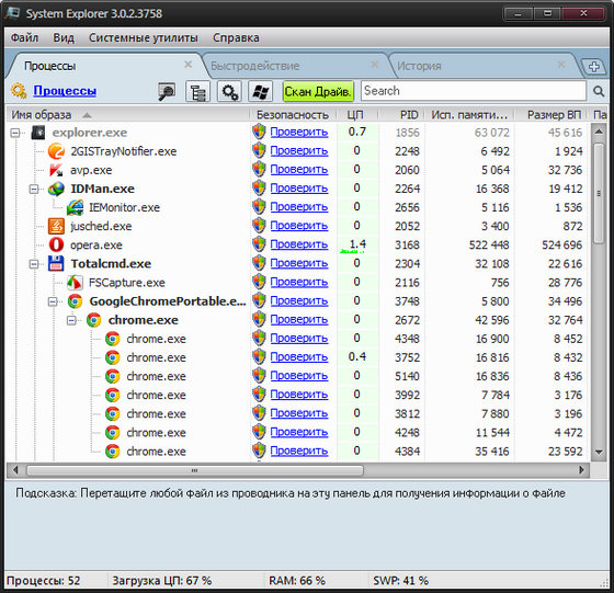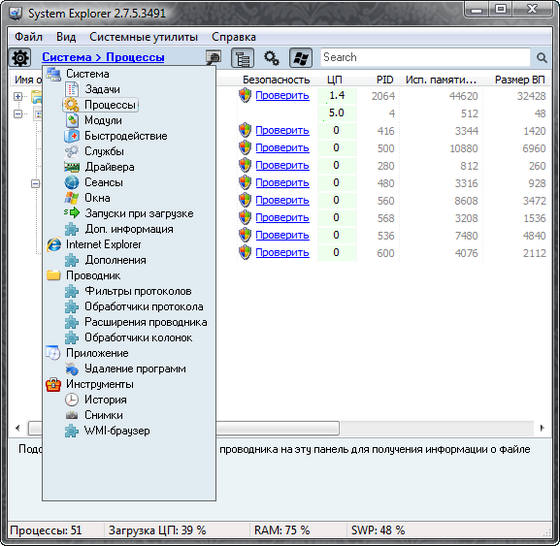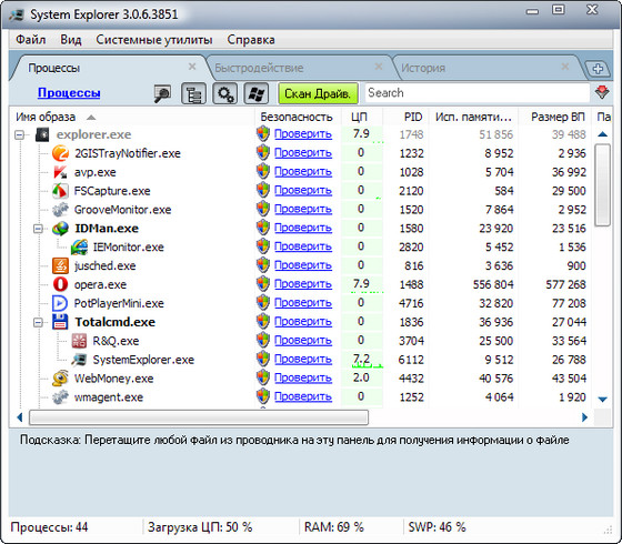 System Explorer - новая версия утилиты, главной целью которой является замена стандартного диспетчера задач Windows. Помимо простого просмотра списка запущенных процессов, вы сможете ими управлять.