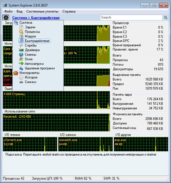 System Explorer - диспетчер задач для Windows. Функциональная, небольшая утилита, способная полностью заменить стандартный диспетчер задач. В System Explorer все строго структурировано и разложено по полочкам. Каждый раздел включает в себя подраздел, в котором и происходят основные манипуляции.