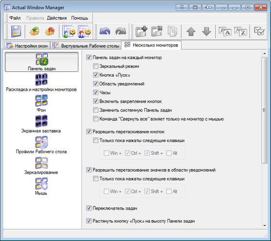 Программа значительно увеличивает функциональность компьютера в части работы с несколькими мониторами, увеличивая общую эффективность использования дополнительного экранного пространства. Actual Multiple Monitors обогащает интерфейс Windows и значительно повышает удобство использования нескольких мониторов. Приложение можно бесплатно скачать на Cwer.ru.
