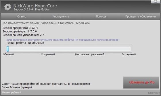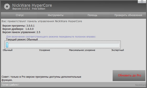 NickWare HyperCore - уникальная и бесплатная программа для настройки процессора и ОС. Она имеет простой и приятный интерфейс, который существует лишь для настройки основного компонента программы - драйвера. Для каждого процессора программа автоматически подбирает и устанавливает свой драйвер, оптимизированный для наибольшего увеличения производительности.