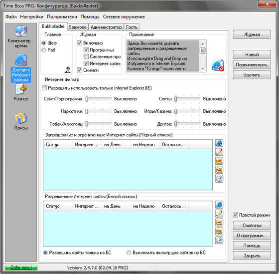 Программа для контроля доступа к компьютеру, которая имеет простой дружелюбный интерфейс и множество полезных функций, использует защиту паролем, ведет журнал компьютерных событий и полную статистику использования. Time Boss позволяет создавать индивидуальные профили для любых пользователей вашего компьютера и указывать, когда и сколько каждый из них может пользоваться компьютером, назначать программы и web-сайты, которые Time Boss должен блокировать.