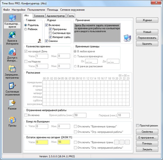 Time Boss - универсальная программа для ограничения времени работы компьютера. Имеет целый набор выверенных и полезных функций для родительского контроля: от установки временного ограничения для конкретных пользователей до сбора статистики использования Вашего ПК и ведения журнала использования программ и сайтов.