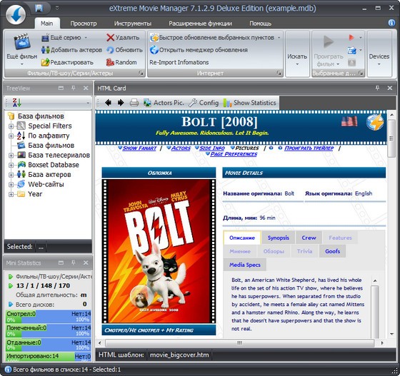 eXtreme Movie Manager - интеллектуальная разработка для ведения домашней фильмотеки. Для каждого фильма предоставлено более 70 полей описания, разделенных по подгруппам. Возможность импорта данных со специализированных сайтов, есть возможность создания собственного импорт-скрипта. Программа поддерживает все существующие сегодня форматы файлов от *.avi и *.mpg до RealMedia. При помощи программы можно не только вести учет коллекции, но и воспроизводить видеофайлы. Программа имеет возможность сканировать диск на наличие имеющихся на винчестере мультимедийных файлов, разрешение которых вы укажете в настройках, и автоматически составляет из них каталог.