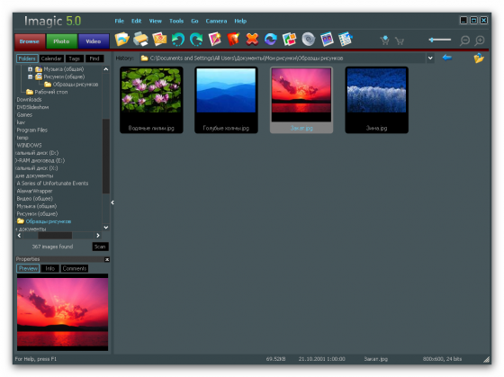 CTOIK Imagic - объединяет в себе функции медиа-браузера, фото альбома, редактора изображений и видео. Imagic предоставляет огромный набор мощных средств улучшения качества фотографий, создания открыток, календарей, художественных эффектов и композиций, слайд-шоу, веб альбомов, и даже компьютерных игр. Программа позволяет автоматически склеивать панорамы и конвертировать RAW файлы. С помощью встроенного видео редактора можно легко и быстро создать наполненный эффектами фильм из ваших видео роликов и фотографий.