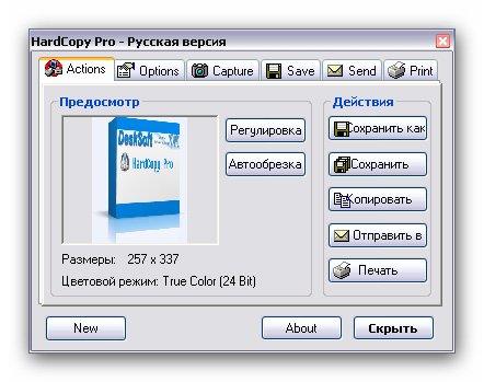 HardCopy Pro - многосторонняя и простая в использовании утилита для захвата экрана в операционных системах Windows. Позволяет захватывать прямоугольные области или полные окна. Снятые изображения могут быть с легкостью обрезаны и изменена глубина цвета в любую заданную величину от монохрома до полноцветного изображения. Изображения могут быть распечатаны, сохранены, копированы в буфер обмена, отправлены по электронной почте, отредактированы любым графическим редактором и многое другое.