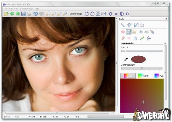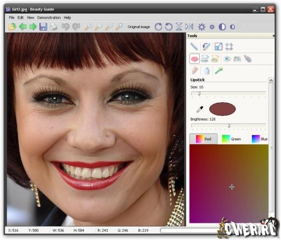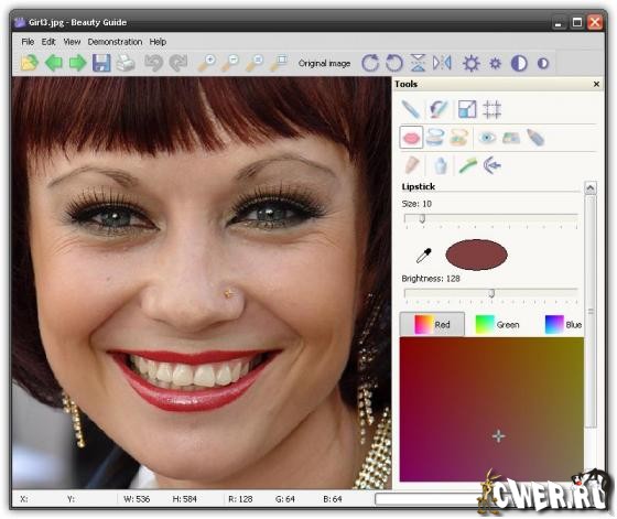 Beauty Guide - программа, с помощью которой можно нанести макияж и устранить косметические дефекты непосредственно на фотографии. Отредактированные с помощью этой программы, Ваши фотографии станут еще лучше! Beauty Guide поможет накрасить губы, нанести румяна, тени и пудру, подвести глаза и изменить их цвет, разгладить морщины, уменьшить отеки, припухлости и мешки под глазами, удалить родимые пятна и бородавки, отбелить зубы. Все это Вы сможете отредактировать прямо на фото.