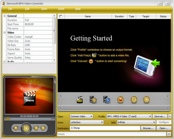 3herosoft MP4 Video Converter - конвертер большинства популярных аудио и видео форматов в форматы для мобильных устройств, поддержка AVI, MPEG, DivX, MOV, RM, WMV, 3GP, VOB, H.264/MPEG-4 AVC, VCD, DV и других видео форматов, поддержка iPhone, iPod, PSP, Apple TV, Archos AV500, Archos AV700, Archos Gmini402, iRiver PMP-100, Creative Zen Vision и других, конвертер WMA, MP2, OGG, RA, AC3, CDA аудио в MP3, AAC, M4A форматы, извлечение аудио из видео файлов в MP3, AAC, M4A форматы, поддержка выбора начала и конца в файлах для конвертирования или извлечения, пакетный режим конвертирования, выбор и настройка параметров конвертирования, извлечения, поддержка изменения размера картинки и переконвертирования в том-же формате, создание и редактирование ID3 тэгов, предварительный просмотр или прослушивание в встроенном проигрывателе.
