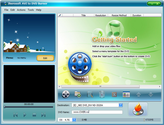 3herosoft AVI to DVD Burner - программа для создания полноценных видео DVD проектов с прожигом (записью) на DVD носитель. Используя данную программу у вас есть возможость создать видео DVD из AVI, MPEG, DAT, MPG, VOB видео форматов, полноценные меню и субтитры, выборать из стандартных или собственных настроек параметров картинки, битрейда, фреймрейда, качества и других параметров DVD видеои др.
