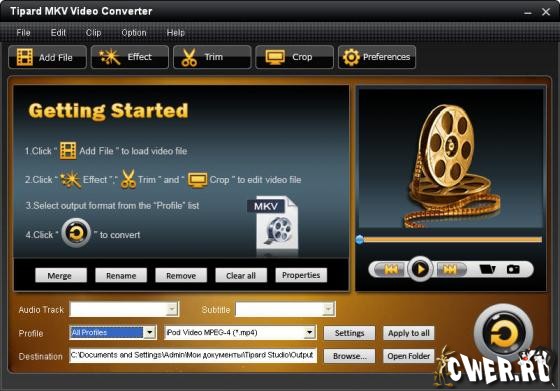 Tipard MKV Video Converter - конвертер MKV видео в другие популярные видео форматы, поддержка MKV, AVI, WMV, MPG, MKV конвертирования в AVI, MP4, WMV, FLV, 3GP, 3G2, MOV, MPG и другие форматы, извлечение аудио из видео файлов в MP3, AAC, M4A, WMA, WAV, AC3, OGG форматы, поддержка iPod, iPhone, Zune, PSP, PS3, Xbox и других, пакетный режим конвертирования, настройка параметров сохранения и конвертирования, предварительный просмотр и т.д.