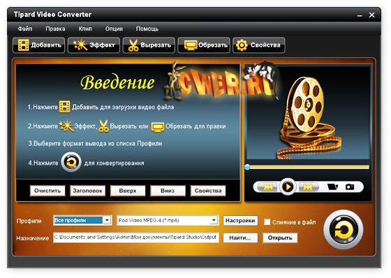 Tipard Video Converter - профессиональный конвертер видео файлов: MPG, MPEG, MPEG2, VOB, MOD, MP4, H.264, AVI, WMV и др. Также он может извлекать аудио из видео и конвертировать его в M4A, MP3, AC3, AAC, WMA, WAV, OGG. Конвертированные файы могут использоваться на портативных плеерах PSP, iPhone (3G), iPhone, Zune, Zune 2, Blackberry, Creative Zen, Sony Walkman, iRiver PMP, Archos, PS3, Apple TV, Xbox, iPAQ, Pocket PC, Mobile Phone и др.