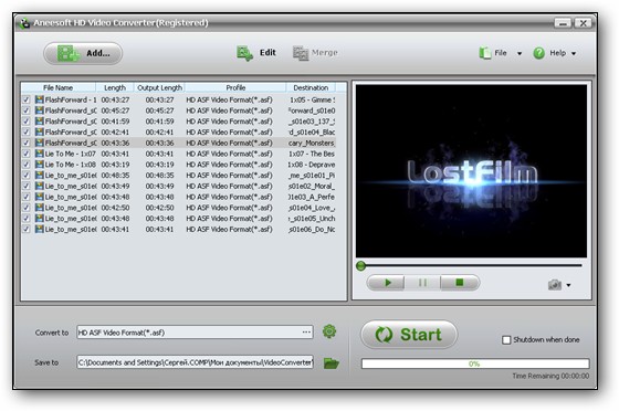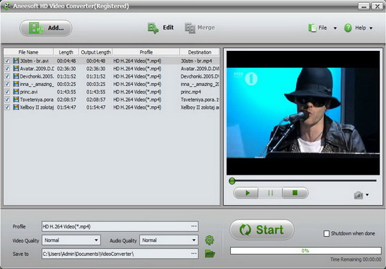 Aneesoft HD Video Converter - конвертер видео файлов различных форматов в HD видео и обратно, поддержка AVCHD (mts, m2ts), H.264/AVC, MKV, MPEG-2 (ts), HD AVI, HD FLV, HD WMV, MPEG-4, Quick Time MOV и других видео форматов, поддержка iPod, iPhone, PSP, PS3, Apple TV, Mobile phone, MP4 players и других, пакетный режим конвертирования, предварительный просмотр результата в встроенном проигрывателе.