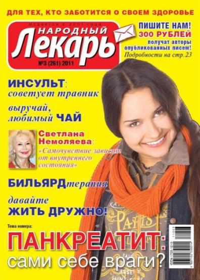 Это издание создано для тех, кто заботится о своем здоровье, ведёт здоровый образ жизни и интересуется как традиционными, так и народными методами лечения. Тема номера - панкреатит: к чему ведут последствия неправильного питания. Также в номер вошли следующие материалы: отек брюшной полости, собираем лекарственные травы зимой, когда болят суставы, инсульт с потерей речи, рецепты из конверта, применении черного и зеленого чая в домашней косметике.