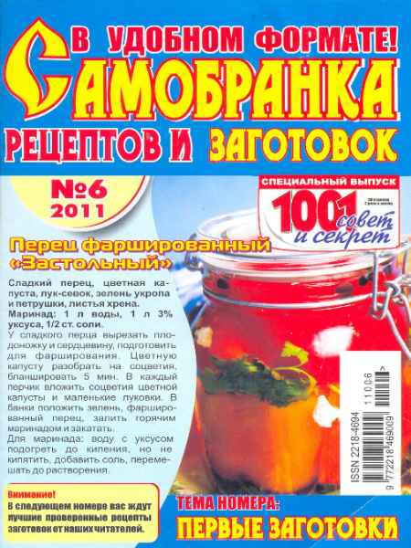 Журнал создан по лучшим рецептам, присланным в редакцию читателями и одобрен ими и их близкими. Этот номер будет очень полезен хозяйкам.