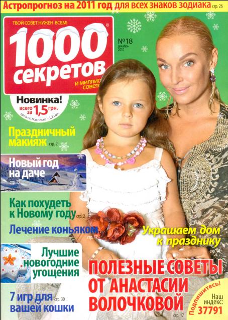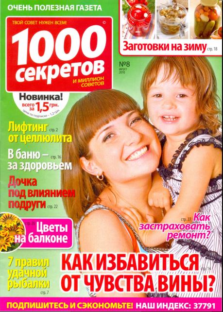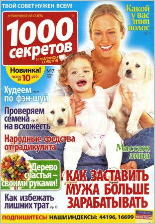 "1000 секретов" - народный журнал, который будет полезен каждому без исключения. Он содержит по несколько полос из каждой области человеческой жизни: воспитание детей, кулинария, здоровье, строительство и ремонт, сад и огород, умелые руки, дизайн, физическое развитие, психологические и юридические консультации.
