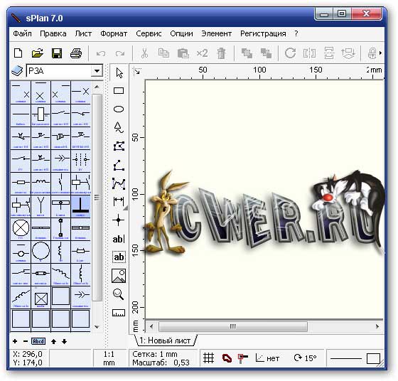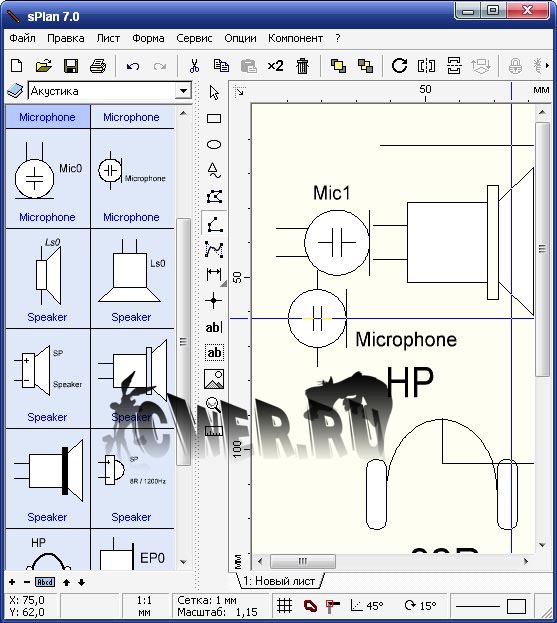 Графический редактор с элементами, позволяющими легко рисовать электрические схемы. Очень простой и интуитивно понятный интерфейс. Может использоваться как текстовый редактор, легко составляются таблицы. Для рисования электрических схем имеется несколько библиотек, элементы которых могут легко редактироваться и добавляться, есть функция автоматической нумерации элементов, привязка линий к выводам элементов, группировка элементов, привязка к сетке. Возможность рисования линий под определенным углом, поворот элементов, вставка рисунка, экспорт в форматы jpg, bmp. Удобный вывод на печать.